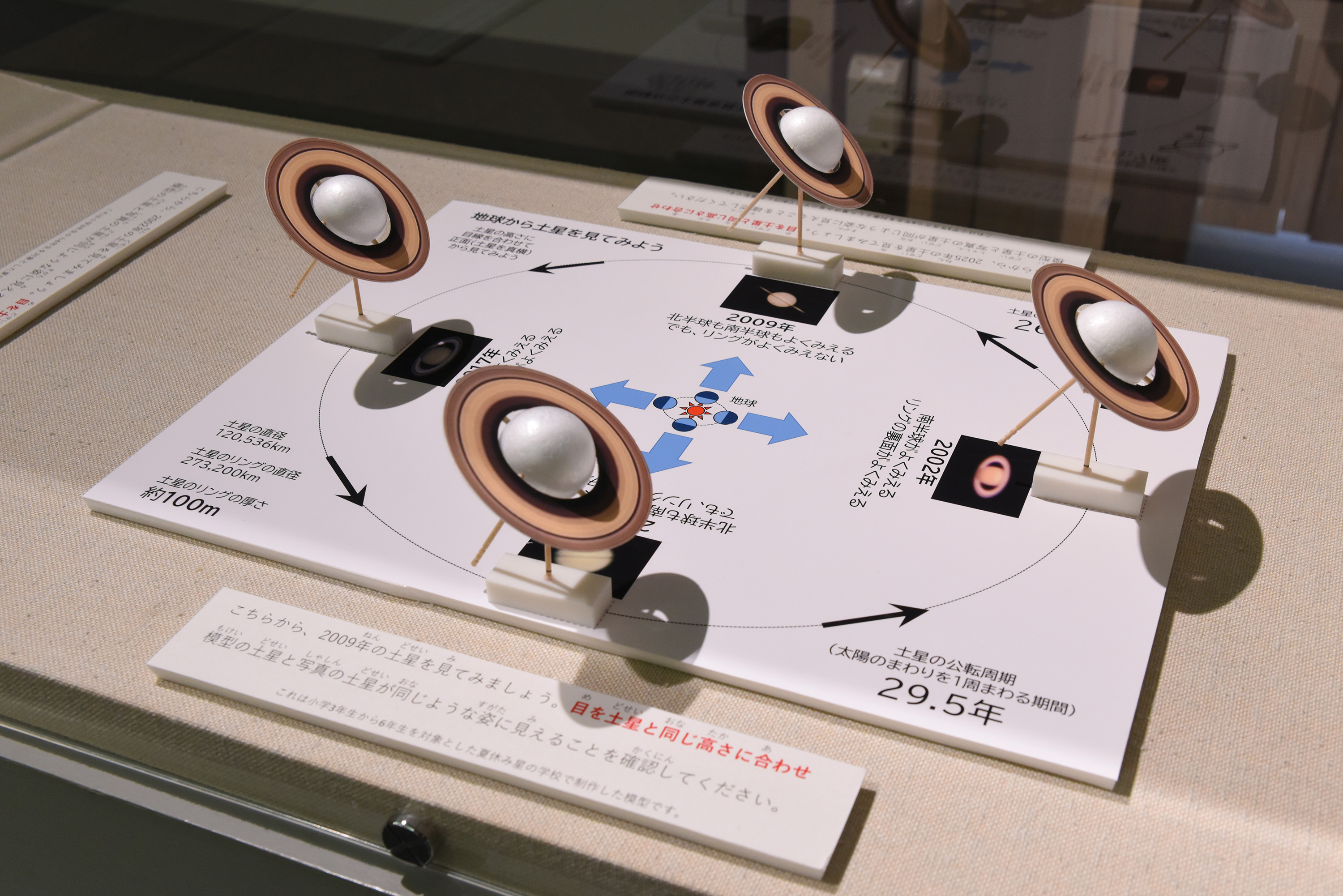 土星を観察する年によって、土星のリングが見えたり見えなかったり、表面が見えたり裏面が見えたりしますが、なぜそのように見た目が変わるのか。展示中の模型をのぞいて体感しよう!