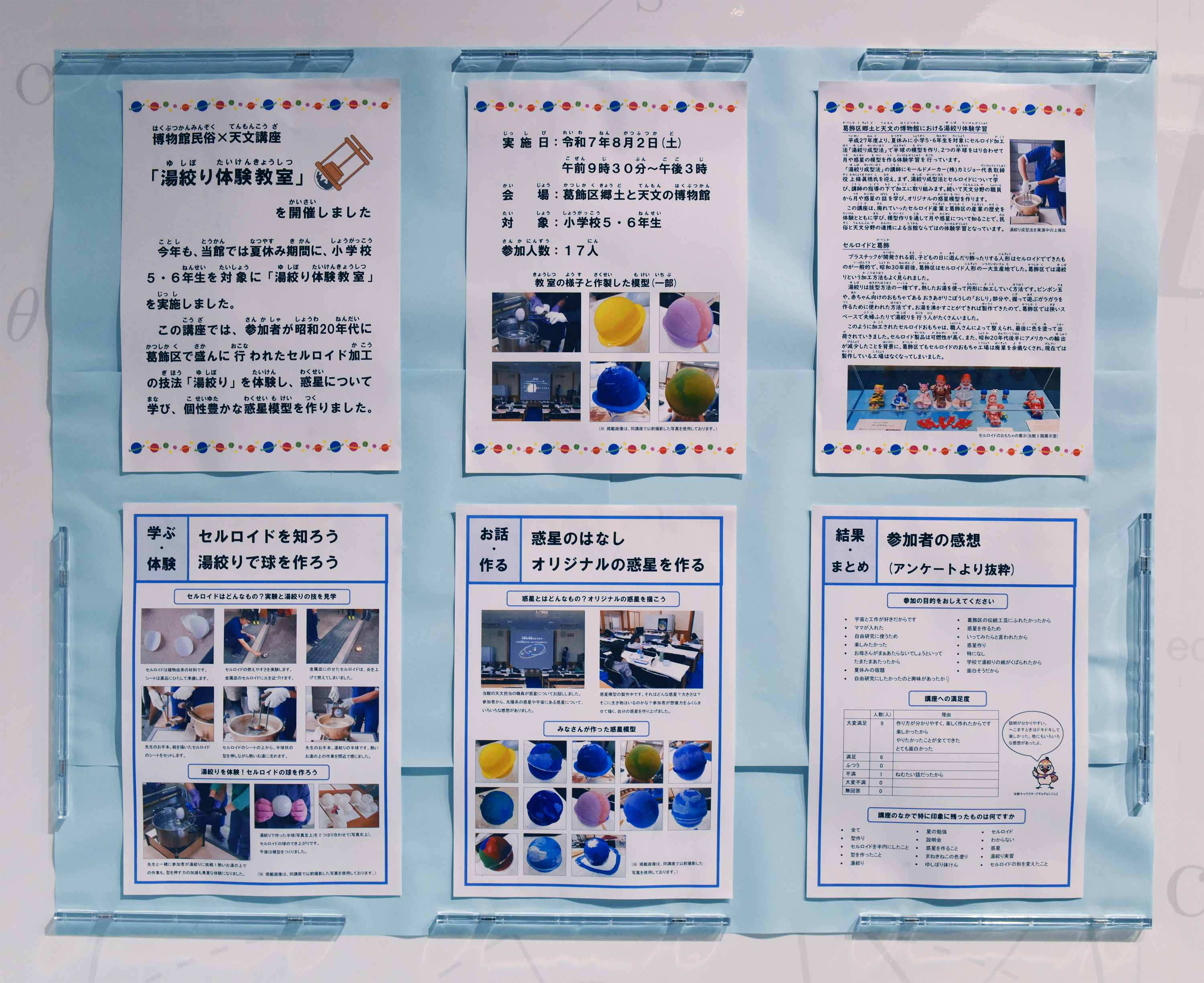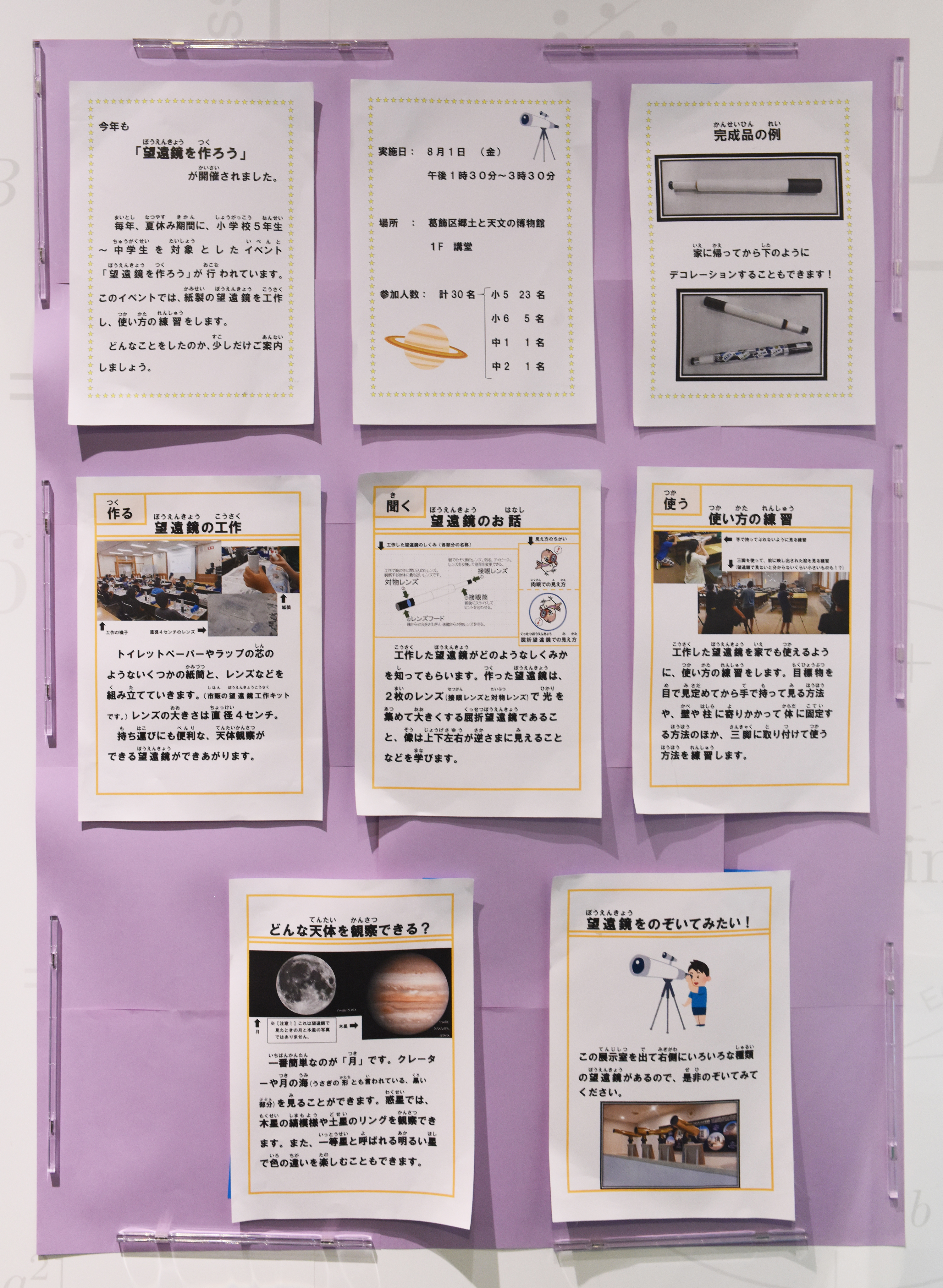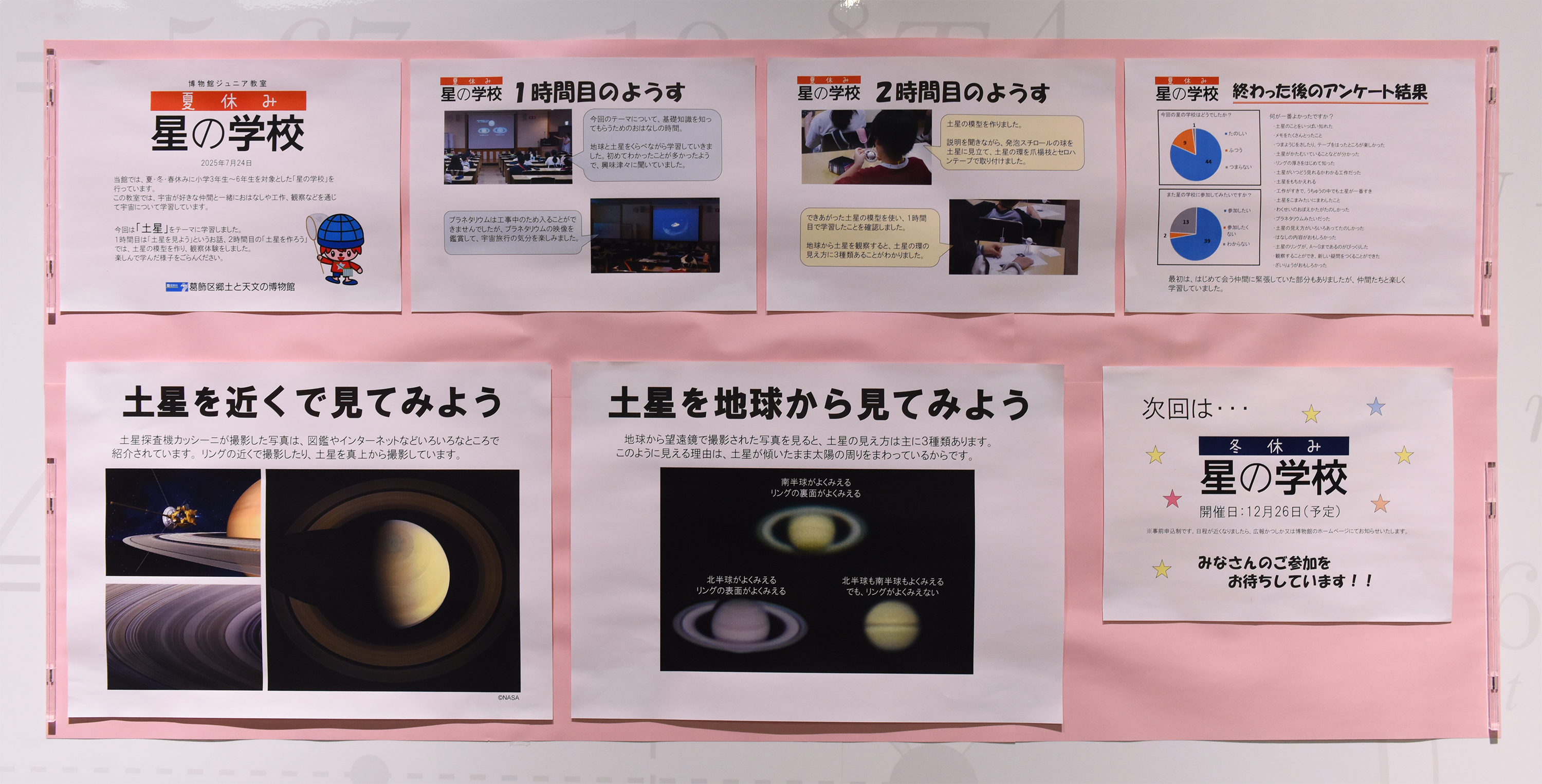 令和7年10月8日天文展示室では「夏休みイベントレポート2025」として、夏休み中に開催した天文関係のイベントについて展示しています。「夏休み・星の学校」「望遠鏡を作ろう」「湯絞り体験教室」の3つで、いずれも夏休みの恒例イベントとなっています。