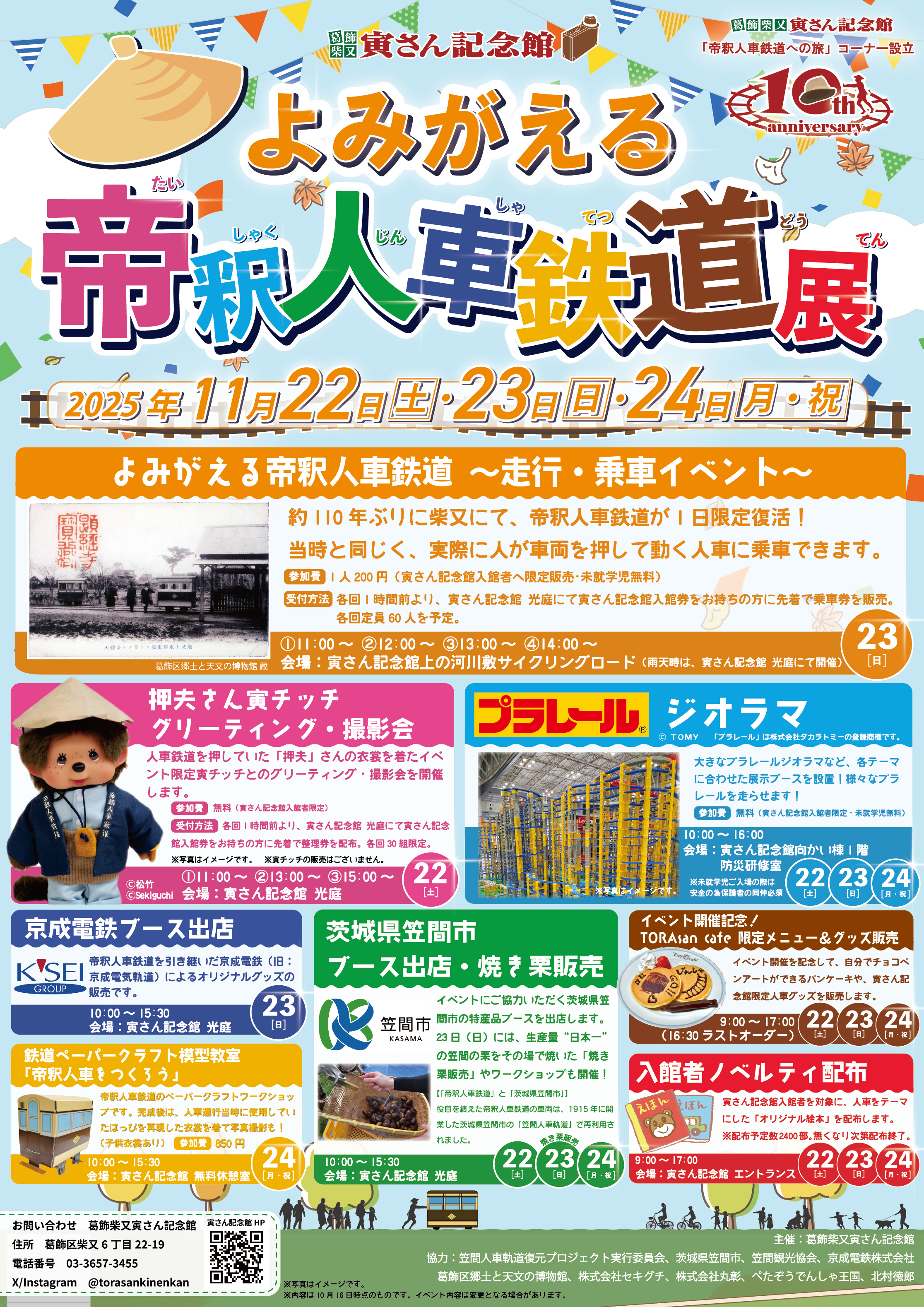 明治から大正にかけて、柴又と金町を結び、参拝客を乗せて走っていた「帝釈人車鉄道」をテーマに3日間さまざまなイベントを開催します。