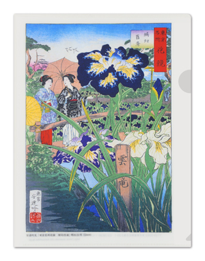 葛飾区の花「花菖蒲」がモチーフの浮世絵をクリアファイルにしました。A5(A4の半分)の紙がちょうど収まるサイズです。バッグに入れやすく、メモやはがき、レシートなどを整理するのに便利です。